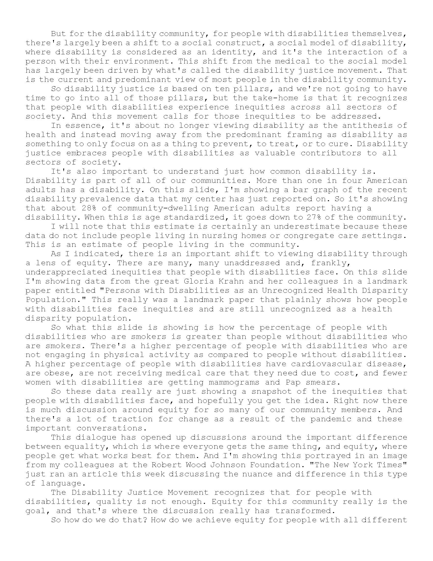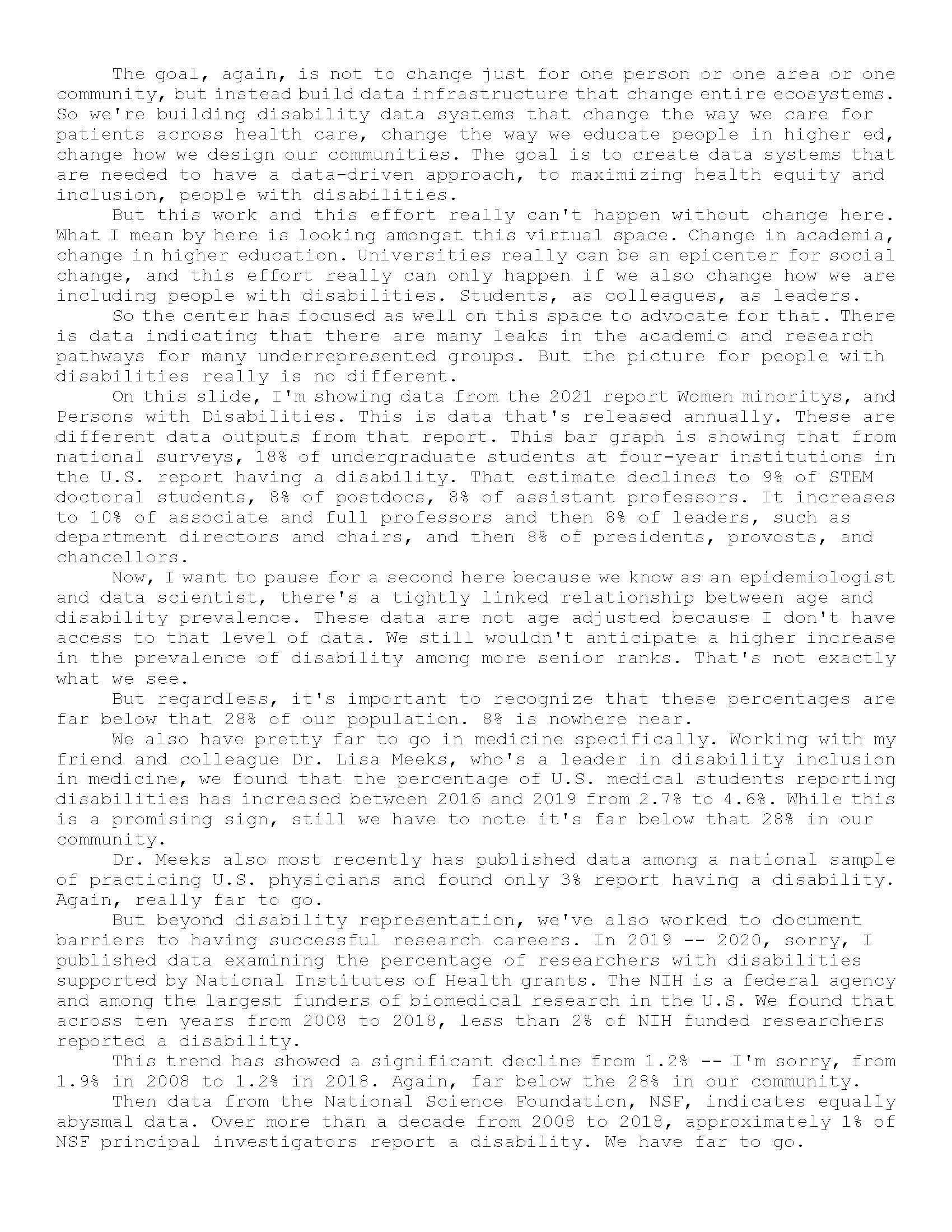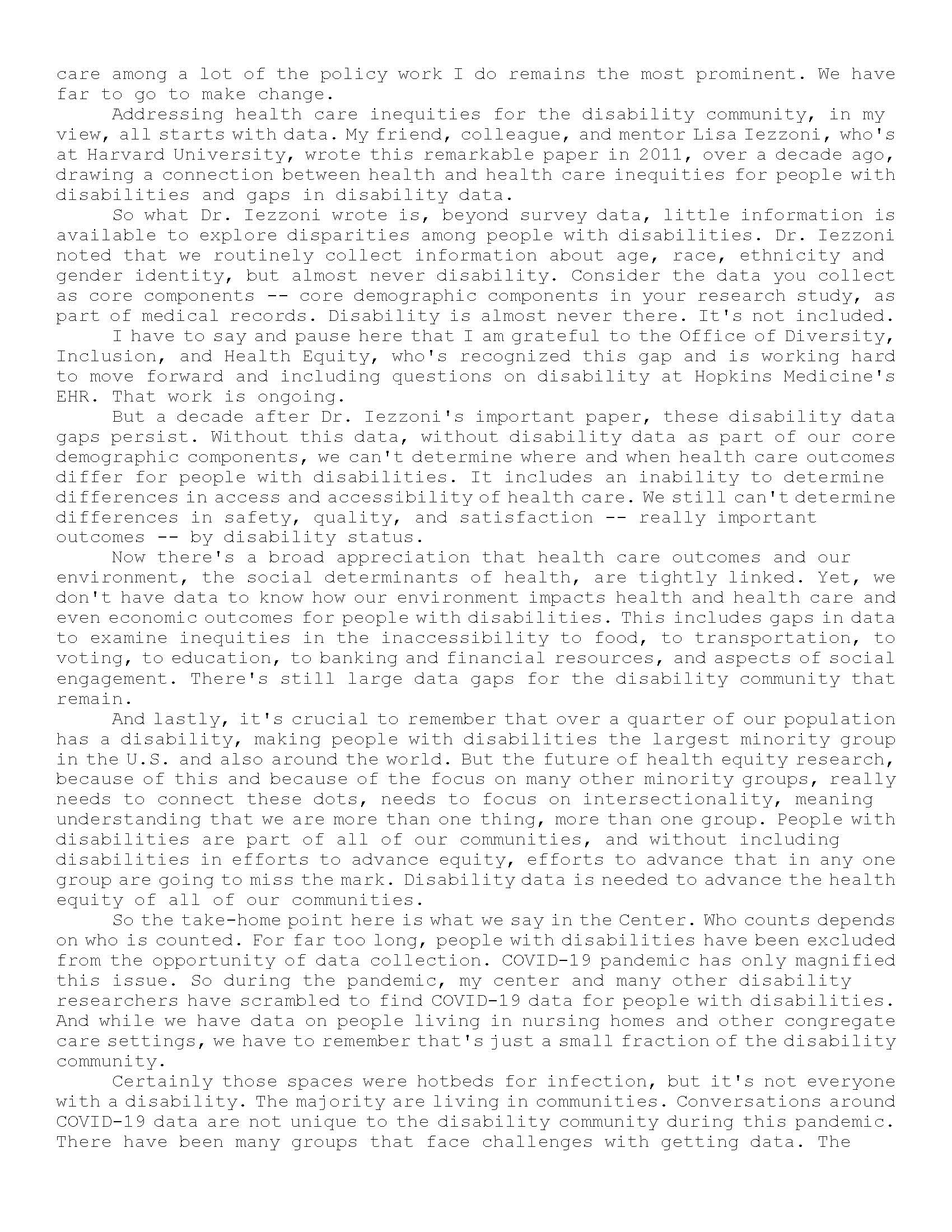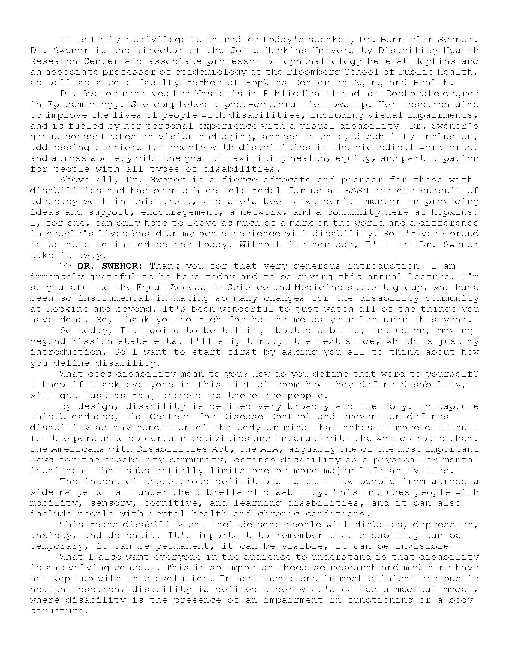 Introduced by PhD student, Erica Avery, Dr. Bonnielin Swenor, Director of the Johns Hopkins Disability Health Research Center, delivered the November 2021 Equal Access lecture, in collaboration with the Biomedical Scholars Association and the Student National Medical Association Minority Association for Premedical Students, sponsored by the Johns Hopkins Disability Health Research Center, the Johns Hopkins Alumni Association, Johns Hopkins University Student Disability Services, the Johns Hopkins School of Medicine Office of Graduate Biomedical Education, the Johns Hopkins Medicine Office of Diversity, Inclusion and Health Equity, and the Johns Hopkins School of Medicine Graduate Student Association.